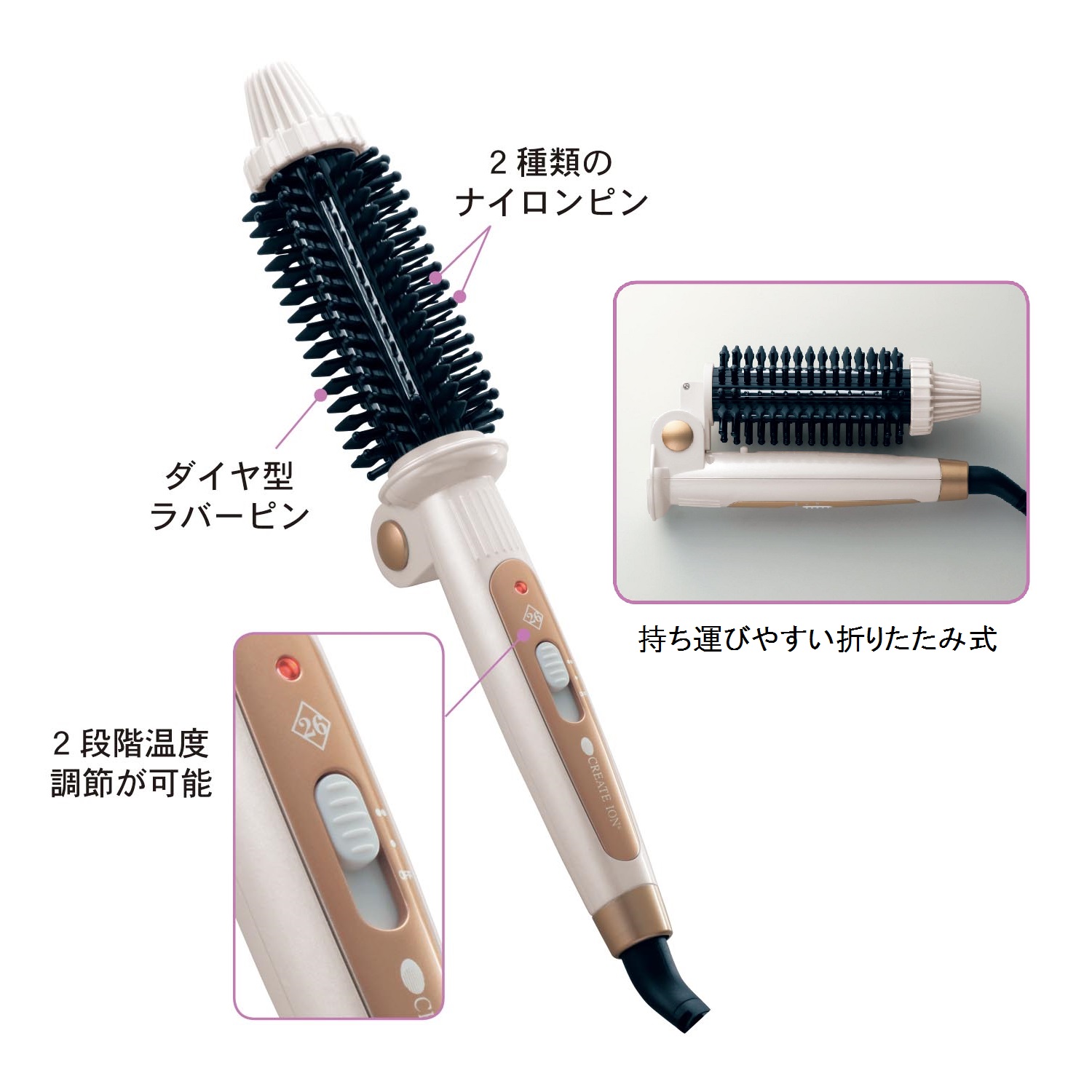 人気のブラシ型ヘアアイロンが、新発想のダイヤ型ラバーピンでより髪の毛をキャッチしやすい形に。