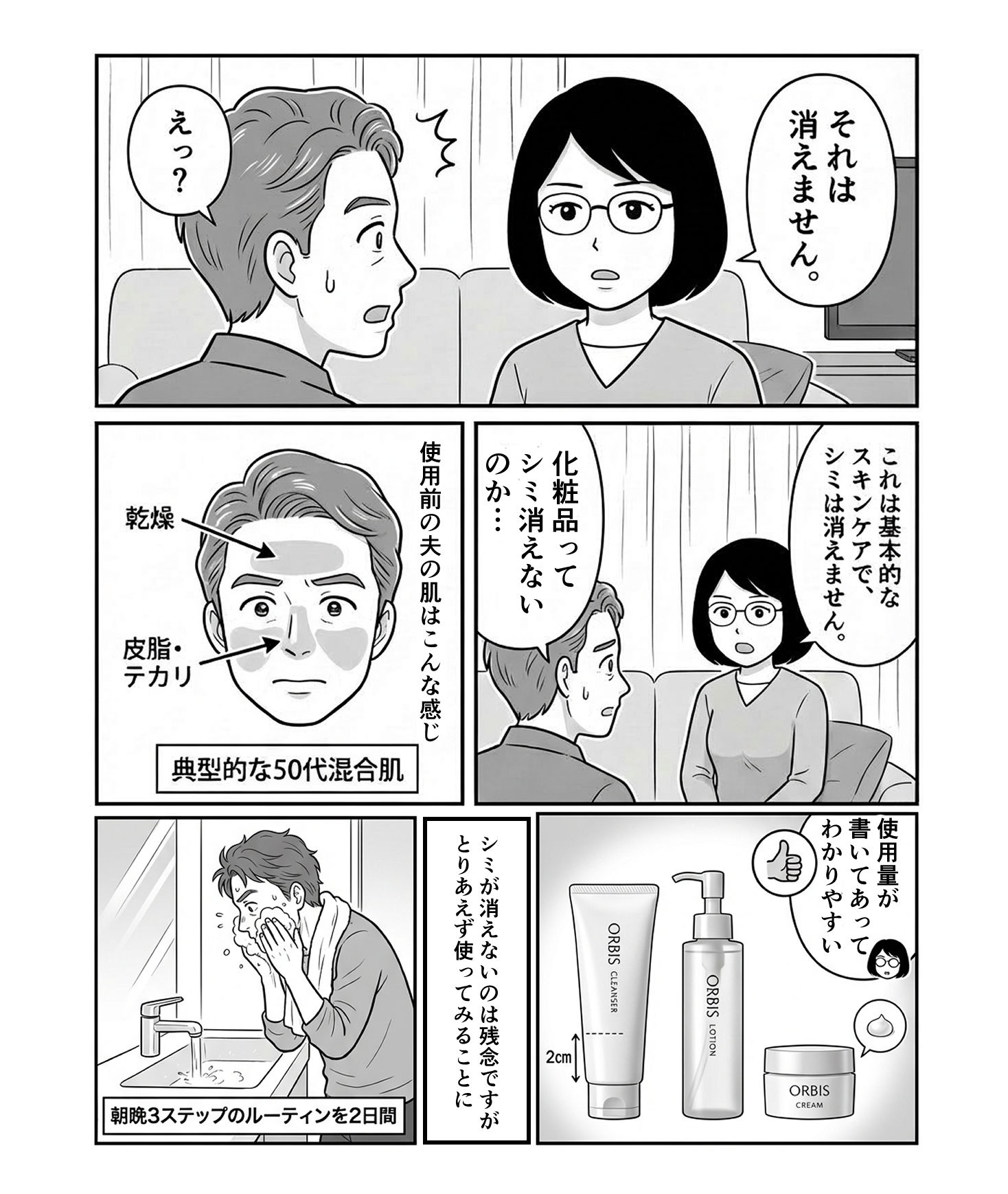 > 私: 「オルビスのメンズスキンケアもらってきたけど、使ってみる?」