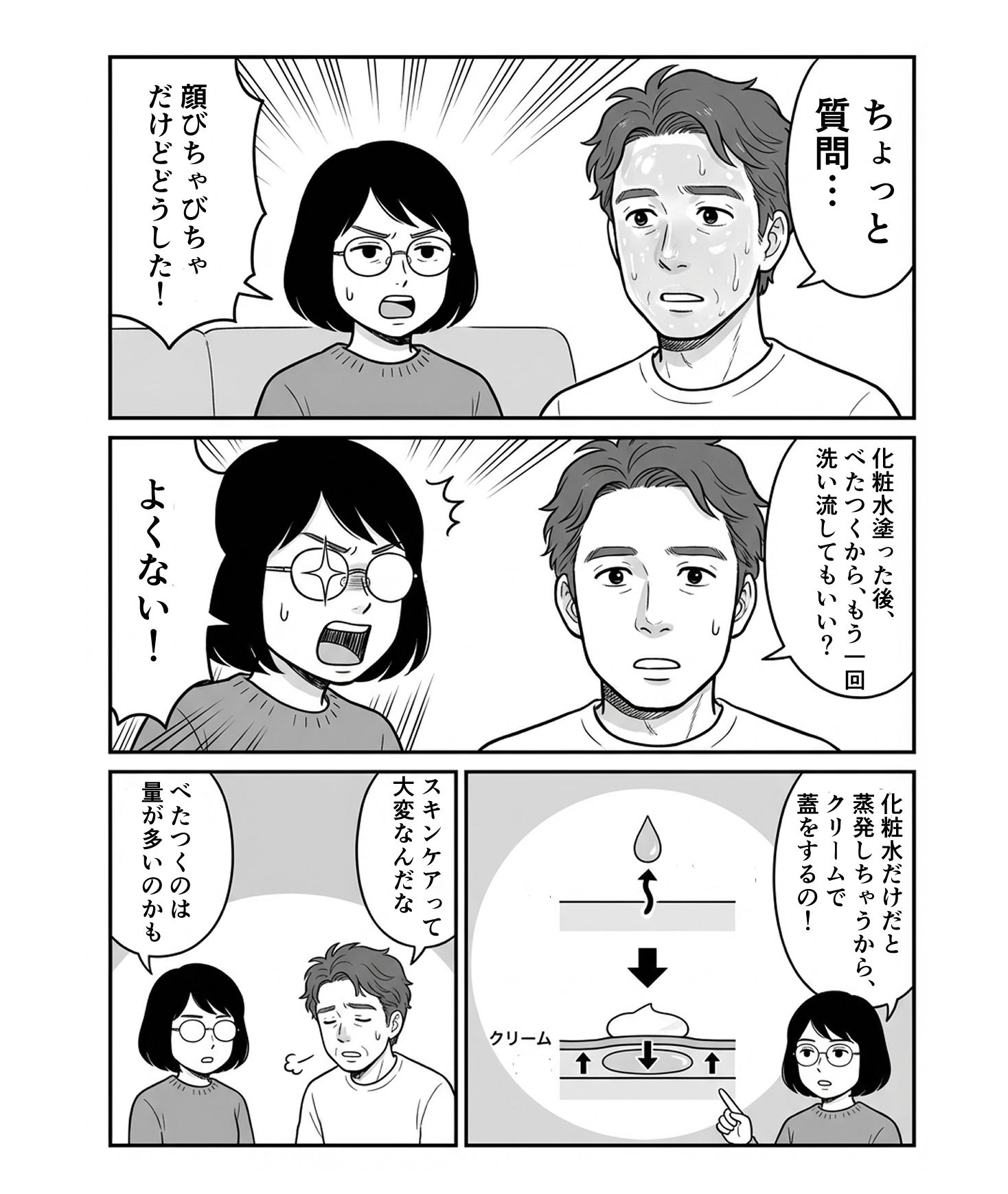 > 夫: 「化粧水を塗った後、べたつくからもう一度洗い流してもいいのか?」