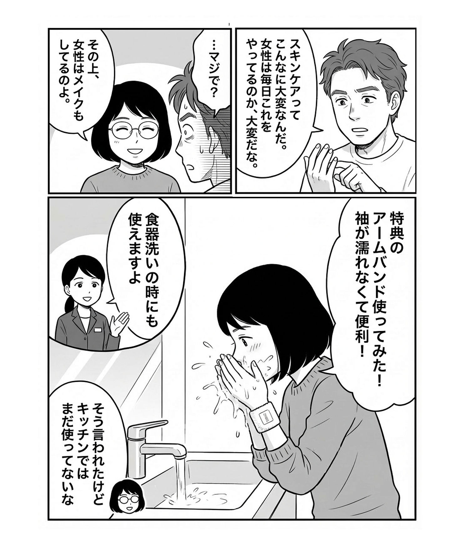 - 実用的な特典: アームバンドが洗顔時の袖濡れ防止に効果的