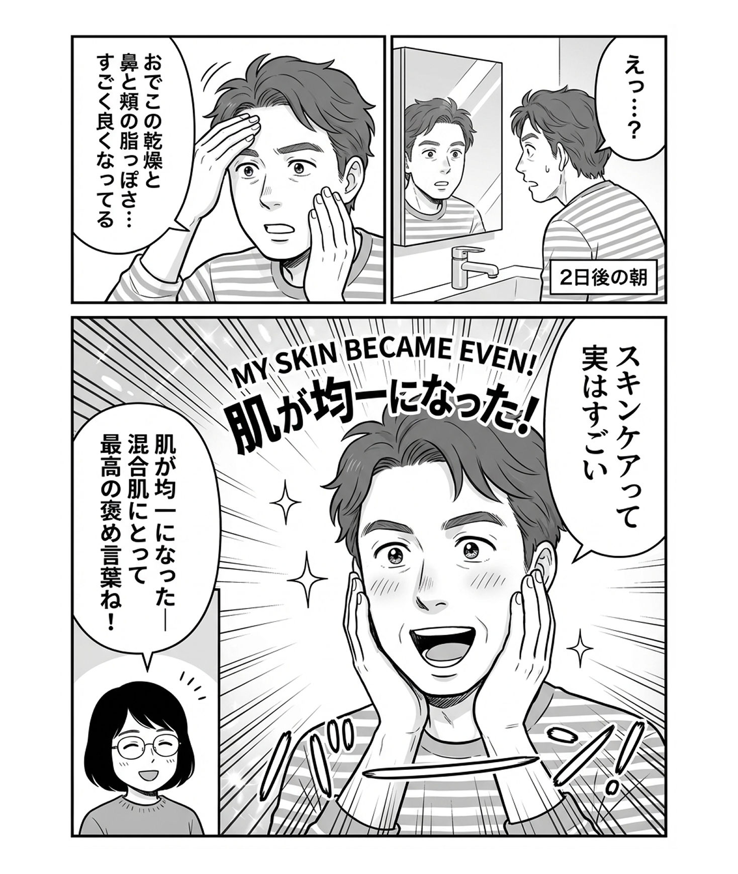 - 肌の均一化: 眉間のカサカサと鼻・頬の油っぽさが2日間で気にならなくなった(夫談)