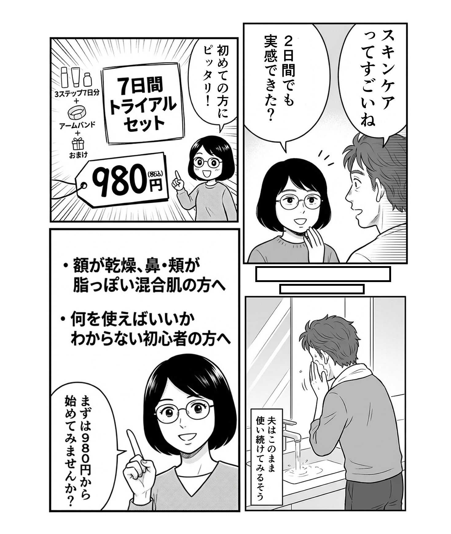 「何から始めればいいかわからない」スキンケア初心者の男性には、まず980円の体験セットから試してみるのが一番ハードルが低いと思います。